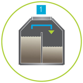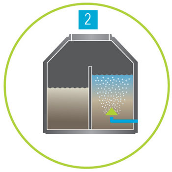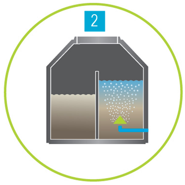 El agua residual se trata en primer lugar en el búfer de almacenamiento de lodos (primera cámara), en el cual se retienen los sólidos. Desde allí, el agua residual se conduce en poco a poco al depósito SBR (segunda cámara).