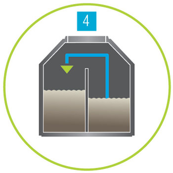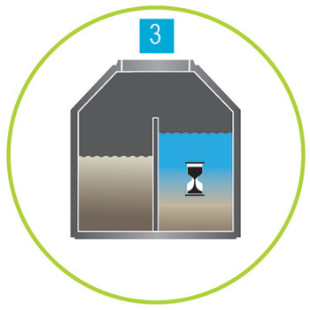 Durante la fase de reposo, el fango activado sedimenta hacia el fondo del depósito miestras que se crea una lámina de agua limpia en la parte superior del compartimento. .